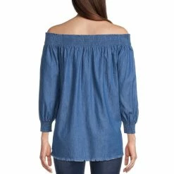 Top 10 😀 Calessa Smocked Off-the-Shoulder 3/4 Sleeve Embroidered Denim Peasant Top Indigo Multi 🛒