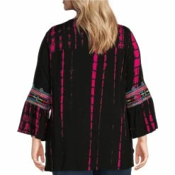Deals 🔔 Calessa Plus Size Matte Jersey V-Neck 3/4 Sleeve Side Button Trim Tiered Hem Tunic Purple ⭐