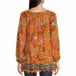 Promo 🤩 Calessa Floral Embroidered 3/4 Bell Sleeve Split Round Neck Ruffle Hem Top Black Multi 🥰