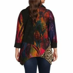 Promo 🎉 Calessa Plus Size Patchwork Print Drape Neck 3/4 Sleeve Asymmetric Hem Tunic Black Multi 👏