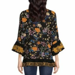 Promo 🤩 Calessa Floral Embroidered 3/4 Bell Sleeve Split Round Neck Ruffle Hem Top Black Multi 🥰
