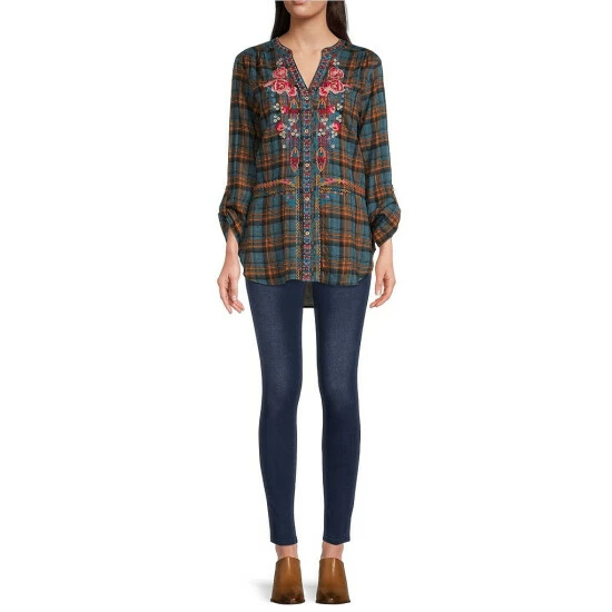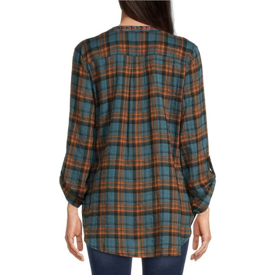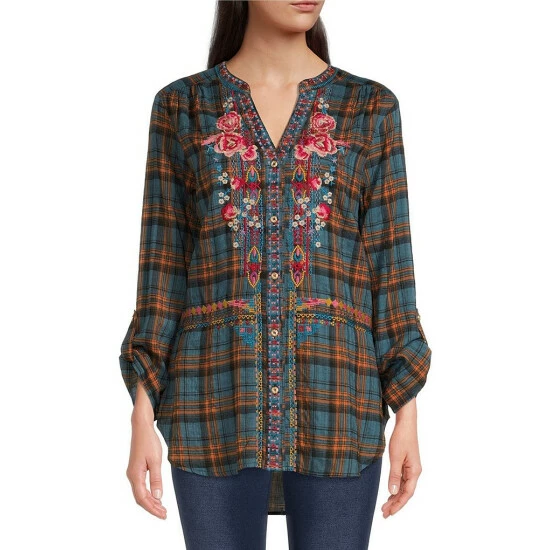 - Plaid print and floral embroidery